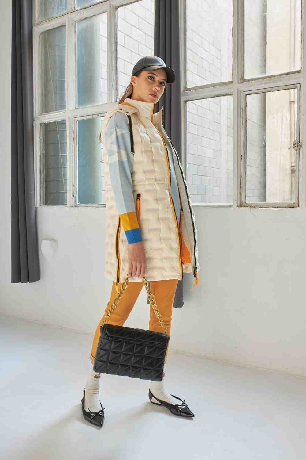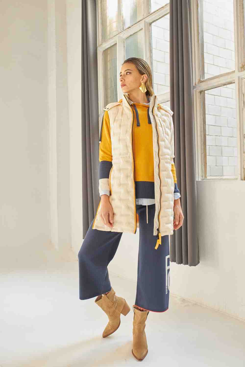 CHALECO LARGO CON CAPUCHA CREMALLERA Y BOLSILLOS