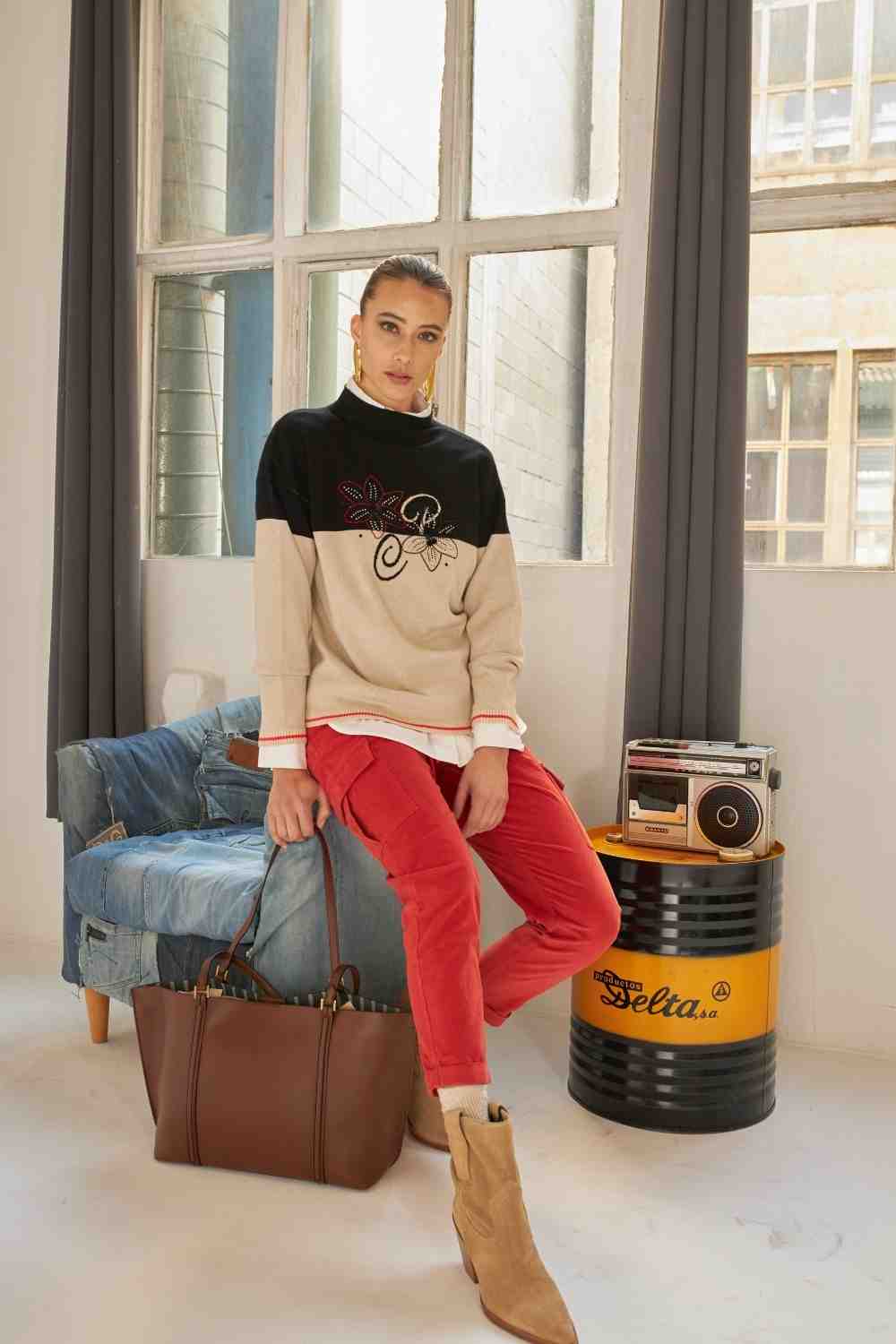 JERSEY CUELLO ALTO CON LETRAS EN EL FRONTAL Y DETALLES DE LINEAS EN MANGAS BAJO